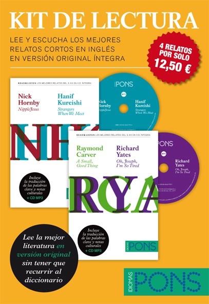 - Edición limitada de dos kits de lectura, cada uno contiene 2 libros con cuatro relatos y 2 CD por solo 12,50 ?. - El Kit de Lectura. Men agrupa a estos autores: Nick Hornby, Hanif Kureishi, Raymond Carver y Richard Yates. - Cada relato cuenta con un extenso glosario a pie de página para comprender correctamente expresiones, matices del idioma y referencias culturales. - Cada CD contiene los textos de dos relatos grabados por locutores nativos en formato MP3. - Dirigido a estudiantes de inglés y a aficionados a la lectura de la mejor literatura actual en inglés.