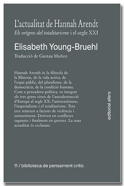 Hannah Arendt és la filòsofa de la llibertat, de la vida activa, de l’espai públic, del pluralisme, de la democràcia, de la condició humana. Com a pensadora política, va integrar els tres grans eixos de l’autodestrucció d’Europa al segle XX: l’antisemitisme, l’imperialisme i el totalitarisme. Tots tres remeten a factors de violència i sotmetiment. Deriven en conflictes sagnants i finalment en guerres. La seua actualitat és esclatant.