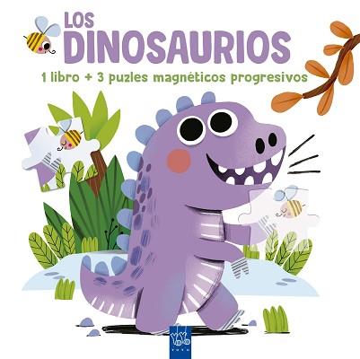 Un estuche de cartón que viene con un libro para aprender primeros conceptos sobre los dinosaurios y tres puzles magnéticos sobre escenas que encontrarás en la historia.