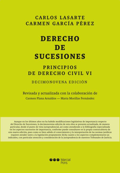 El presente tomo, sexto y último de los Principios de Derecho civil del profesor Lasarte, se encuentra dedicado al Derecho hereditario o Derecho de sucesiones, ofreciendo una visión completa e institucional de la materia. En su análisis, junto con la precisión y profundidad de los contenidos, sobresale una acertada sistemática de exposición a efectos pedagógicos, pese a la evidente complejidad del empeño. La nueva edición de esta obra se presenta actualizada, de manera particular, desde el punto de vista jurisprudencial, así como atendiendo a la bibliografía especializada en los aspectos sucesorios de importancia, pues como es bien sabido el conocimiento y la interpretación de las normas jurídicas requiere atender tanto a la legislación propiamente dicha cuanto a los aspectos complementarios indicados, con particular atención y consideración de la jurisprudencia de nuestros Tribunales de Justicia.